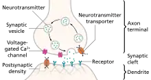 Muchos fármacos antidepresivos aumentan de forma aguda los niveles sinápticos del neurotransmisor monoamina, la serotonina, pero también pueden aumentar los niveles de norepinefrina y dopamina. La observación de esta eficacia dio lugar a la hipótesis monoamínica de la depresión, que postula que el déficit de determinados neurotransmisores es responsable de la depresión, e incluso que determinados neurotransmisores están relacionados con síntomas específicos. Los niveles normales de serotonina se han relacionado con la regulación del estado de ánimo y el comportamiento, el sueño y la digestión; los de norepinefrina, con la respuesta de lucha o huida; y los de dopamina, con el movimiento, el placer y la motivación. Algunos también han propuesto la relación entre las monoaminas y fenotipos como la serotonina en el sueño y el suicidio, la norepinefrina en la disforia, la fatiga, la apatía y la disfunción cognitiva, y la dopamina en la pérdida de motivación y los síntomas psicomotores.[33] La principal limitación de la hipótesis monoamínica de la depresión es el desfase terapéutico entre el inicio del tratamiento antidepresivo y la percepción de mejoría de los síntomas. Una explicación de este retraso terapéutico es que el aumento inicial de la serotonina sináptica es sólo temporal, ya que el disparo de las neuronas serotoninérgicas del rafe dorsal se adapta a través de la actividad de los autorreceptores 5-HT1A. Se cree que el efecto terapéutico de los antidepresivos surge de la desensibilización de los autorreceptores a lo largo de un periodo de tiempo, lo que finalmente eleva el disparo de las neuronas serotoninérgica.[34]