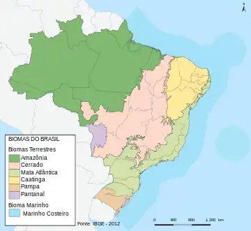 En la esquematización del IBGE (2004),[1] Brasil tiene su territorio ocupado por seis biomas terrestres (o áreas biogeográficas) y un ecosistema marino.