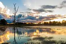 El Pantanal ocupa un área de 150.355 km² y el 1,76% del territorio nacional y está constituido principalmente por sabana esteparia inundada en su mayor parte.[8] El Pantanal está presente en sólo dos estados brasileños, Mato Grosso y Mato Grosso do Sul, ocupando el 7% del territorio de Mato Grosso y el 25% del estado de Mato Grosso do Sul.[9] La región es una llanura aluvial influenciada por ríos que drenan la cuenca del Alto Paraguay, donde se desarrolla una fauna y flora de rara belleza y abundancia.[16] El Pantanal de Mato Grosso es la mayor llanura de inundación continua del planeta, cubierta por una vegetación predominantemente abierta. Este ecosistema está formado por terrenos mayoritariamente arenosos, cubiertos con fisonomías diferentes debido a la variedad de microrrelieves y regímenes de inundación. Como área de transición entre el Cerrado y la Amazonía, el Pantanal cuenta con un mosaico de ecosistemas terrestres con afinidades sobre todo con el Cerrado.