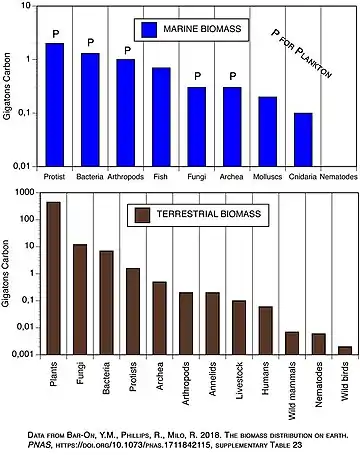 Las estimaciones para la biomasa global de especies y grupos de nivel superior no siempre son consistentes en toda la literatura. La biomasa global total se ha estimado en aproximadamente 550 mil millones de toneladas C.[5][19] La mayor parte de esta biomasa se encuentra en la tierra, con solo 5 a 10 mil millones de toneladas de C en los océanos. En tierra, hay aproximadamente 1000 veces más biomasa vegetal (fitomasa) que biomasa animal (zoomasa). Alrededor del 18 % de esta biomasa vegetal es consumida por los animales terrestres.[20] Sin embargo, en el océano, la biomasa animal es casi 30 veces más grande que la biomasa vegetal.[21] La mayor parte de la biomasa de las plantas oceánicas es consumida por los animales oceánicos.