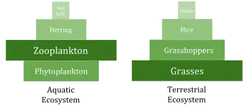 Los ambientes marinos pueden tener pirámides de biomasa invertidas. En particular, la biomasa de los consumidores (copépodos, kril, camarones, peces forrajeros) es mayor que la biomasa de los productores primarios. Esto sucede porque los productores primarios del océano son pequeños fitoplancton que son estrategas "r" que crecen y se reproducen rápidamente, por lo que una pequeña masa puede tener una tasa rápida de producción primaria. En contraste, los productores primarios terrestres, como los bosques, son estrategas K que crecen y se reproducen lentamente, por lo que se necesita una masa mucho mayor para lograr la misma tasa de producción primaria.