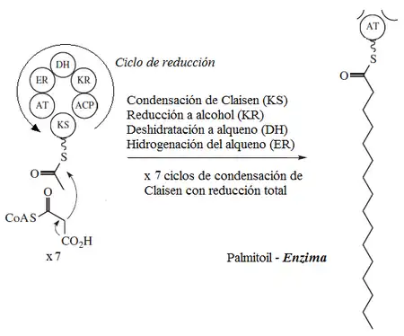 En el primer ciclo se condensan un acetil-ACP y un malonil-ACP (derivado del anterior), por lo que se juntan 4 carbonos de golpe. En los ciclos siguientes ya solo se añadirá un malonil-ACP, por lo que se irán añadiendo carbonos de dos en dos. El producto final del proceso es siempre ácido palmítico, un ácido graso saturado de 16 carbonos, que es inmediatamente esterificado con el coenzima A, para formar palmitoil-CoA (lo mismo se hace con cualquier ácido graso proveniente de la dieta). A partir de él, una vez transportado al retículo endoplasmático, pueden sintetizarse otros ácidos grasos.