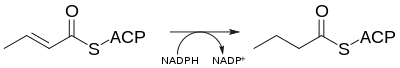 | Reducción del crotonil-ACP | Durante este paso final, el crotonil-ACP es reducido por el NADPH a butiril-ACP. | ![]() | Enoil-ACP reductasa |