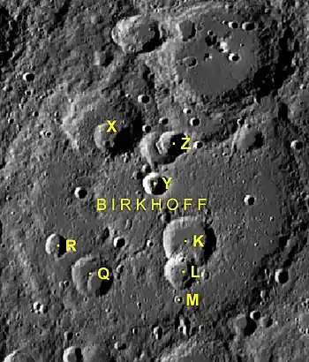 Por convención estos elementos son identificados en los mapas lunares poniendo la letra en el lado del punto medio del cráter que está más cerca de Birkhoff.