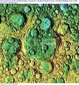 Birkhoff es una llanura amurallada de gran tamaño que se encuentra en la cara oculta de la Luna, en el hemisferio norte. Esta formación es un impacto antiguo fuertemente erosionado, con una superficie invadida por múltiples cráteres en su interior y a lo largo del borde. La pared exterior está rodeada por los cráteres Carnot al sur, Rowland a lo largo del lado oeste, y Stebbins al norte. Justo al noreste está van't Hoff.