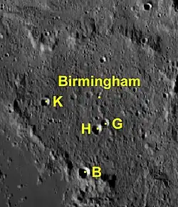 Por convención estos elementos son identificados en los mapas lunares poniendo la letra en el lado del punto medio del cráter que está más cerca de Birmingham.