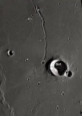 Por convención estos elementos son identificados en los mapas lunares poniendo la letra en el lado del punto medio del cráter que está más cerca de Birt.