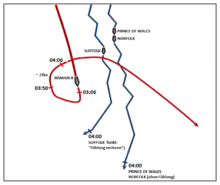 El mal tiempo cesó la mañana del 24 de mayo y dejó paso a un cielo despejado. A las 05:07 de esa mañana los operadores de los hidrófonos del Prinz Eugen detectaron un par de buques sin identificar aproximándose a la formación alemana a una velocidad de 20 nudos (37 km/h).[48]