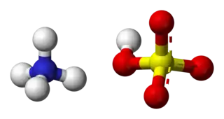 ![]() Modelo de barras y bolas del catión amonio (izquierda) y el anión bisulfato (derecha) | ||
