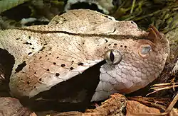 Bitis rhinoceros es una especie de víbora venenosa que es endémica de África Occidental se distingue de una subespecie denominada B. gabonica gabonica principalmente por la presencia de un par de grandes cuernos nasales.