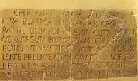 CHR. OPT. MAX. SACRUM. DIVA BLANCA, HISPANIARUM REGINA, PATRE BORBONICO, EX INCLITA FRANCORUM REGUM PROSAPIA, MORIBUS ET CORPORE VENUSTISSIMA FUIT: SED PRAEVALENTE PELLICE, OCCUBUIT JUSSU PETRI MARITI CRUDELI, ANNO SALUTIS 1361, AETATIS VERO SUAE 25.Consagrada a Cristo Sumo Bienhechor y Todopoderoso Señor Nuestro, Doña Blanca Reina de las Españas, hija de Borbón, descendiente del ínclito linaje de los reyes de Francia, fue grandemente hermosa de cuerpo y costumbres, mas prevaleciendo la manceba, fue muerta por mandato del rey D. Pedro I el Cruel su marido. Año de Salud de 1361. Siendo ella de 25 años de edad.