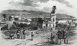 El último gran estallido de violencia fue provocado por la masacre de Marais des Cygnes en 1858, en la que esclavistas asesinaron a cinco hombres contrarios a la esclavitud. En total, aproximadamente 56 personas murieron en Bleeding Kansas cuando la violencia terminó en 1859.[22] Tras el comienzo de la Guerra Civil Americana en 1861, la violencia adicional de la guerrilla estalló en la frontera entre Kansas y Misuri.
