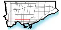 La Línea Bloor-Danforth del Metro de Toronto discurre bajo la parte de Toronto de la calle al este de Kipling Avenue y continúa hacia el este por Danforth Avenue.