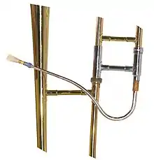 Aquí se muestra un bocal (o tudel) insertado en un trombón. El bocal es la parte que empieza desde el corcho marrón hasta la caña que tiene un hilo gris.