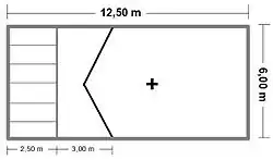 - Pista: La superficie debe ser llana y lisa como el suelo de un gimnasio, preferentemente de madera o plástico sintético, materiales habituales en los polideportivos. El terreno de juego mide 12.5 metros de largo por 6 metros de ancho. El área de lanzamiento se divide en 6 boxes de lanzamiento desde donde el/la jugador/a deberá lanzar sin que ninguna parte de su cuerpo o de la silla pise en las líneas que lo delimitan.[16]