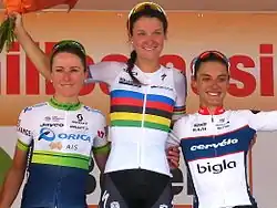 Pódium de la edición 2016 de la carrera: a la izquierda Annemiek van Vleuten, en el centro la vencedora Elizabeth Armitstead, a la izquierda Ashleigh Moolman.