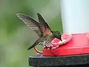 Se alimenta de néctar e insectos. Se aferra a las flores y coloca las alas en V cuando se alimenta, dejando por instantes de aletear.[3]