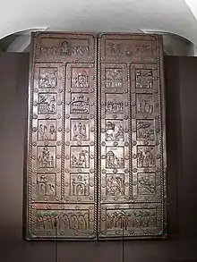 Los paneles, dispuestos en cinco filas presentan además de la historia de Cristo, los Doce profetas en un paraíso de palmeras que ocupan los dos paneles alargados del extremo inferior de la puerta, pasan por la escena del Pecado original a través de una secuencia de figuras ubicado en el panel de los Reyes Magos, terminando en la parte superior de la puerta con los paneles también rectangulares con Cristo y María en la gloria celestial colocados en una arquitectura figurada que domina la escena con bóvedas y pilares.