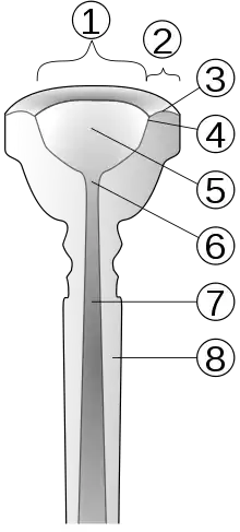 La profundidad y la forma de la copa de la boquilla son los responsables de la sonoridad, la riqueza de armónicos y la facilidad para la interpretación de las notas agudas o graves.