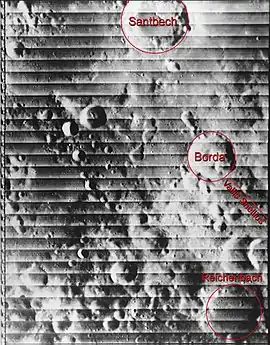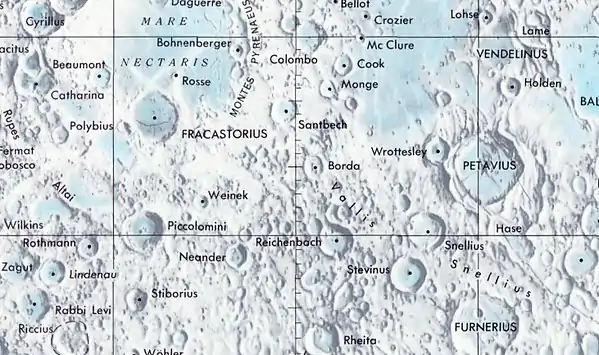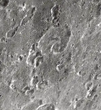 ![]() Cráter Borda (Detalle de la cartografía tomada por la misión espacial Lunar Orbiter 4 en 1967) | ||