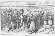 Las cepas son todas de origen francés. Las principales son el cabernet sauvignon, de importancia en las históricas viñas de Medoc, el pinot de Borgoña, el merlan, el malbec, el verdau, y el semillón blanc. Las viñas crecen con espalderas, de acuerdo con el método preferido hoy en algunos de los departamentos más adelantados de Francia con el apoyo de tres hebras de alambre estiradas entre postes de hierro, lo que elimina la necesidad de estacas. Las melgas están a una distancia de unos cuatro pies seis pulgadas [1,37 mts.] y la misma separación se deja entre todas las plantas. El sistema de cultivo es, en general, el que ahora se emplea en la región de Burdeos. Sin embargo, por las particularidades del clima de Chile ha sido preciso instalar riego artificial. A lo largo de las melgas se cavan acequias comunicadas con tranques, desde los cuales se deja salir el agua en ciertas épocas, en especial cuando la uva comienza a formarse. Las vides producen al tercer año y se les deja dos brotes a cada lado del troncoWilliam H. Russell, 1890