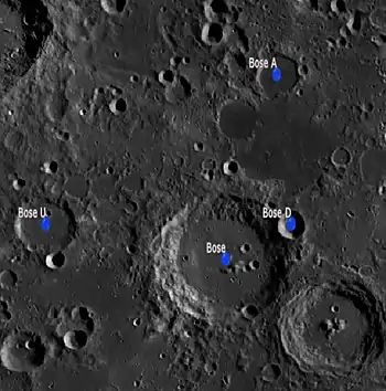 Bose es un cráter de impacto que se encuentra en la cara oculta de la Luna, en el hemisferio sur. Se halla justo al noroeste del cráter más pequeño Bhabha, y al sureste de Alder.