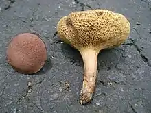 En la parte inferior del sombrero están los poros, que son angulares a alargados y miden aproximadamente 2 mm de ancho. El color de la superficie de los poros es marrón rosado para broncearse o dorarse, pero se vuelve marrón amarillento en la madurez; Las áreas magulladas se vuelven de color ocre y leonado. Los tubos se adhieren un tanto decurrent al estípite (es decir, se extienden ligeramente a lo largo de su longitud) y se extienden aproximadamente 6 mm (0,24 pulg.) De profundidad. El hongo carece de olor o sabor apreciable. El manto seco y sólido mide 2–7 cm (0,8–2,8 pulg.) De largo por 0,6–2 cm (0,2–0,8 pulg.) De grosor, y tiene casi el mismo grosor, o está ligeramente afilado en ambos extremos. Su superficie es más o menos suave, excepto por un área reticulada (mallada) en el vértice. La comestibilidad de la seta es desconocida.[13]