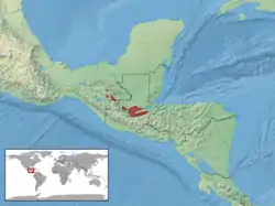 Ocurre en México en las montañas del este de Chiapas, así como el norte de Guatemala. Su hábitat natural consiste de bosque nuboso a una altitud de 1200-2300 m s. n. m. (en raras ocasiones, a alturas mucho más bajas). Puede también ocurrir en bosques subtropicales húmedos (bosque de pino-encino) a lo largo de barrancos húmedos. En Guatemala, se encuentra en las regiones de la Sierra de las Minas y Sierra de Chuacús.[4] La localidad tipo es "Cobán, [Alta] Vera Paz, Guatemala."[1]