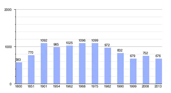 Los datos demográficos contemplados en este gráfico de la comuna de Bourré[4] se han cogido de 1800 a 1999 de la página francesa EHESS/Cassini, y los demás datos de la página del INSEE.[5]