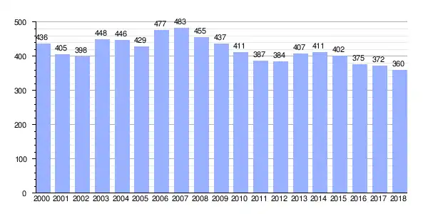 | Gráfica de evolución demográfica de Brabío entre 2000 y 2018 |