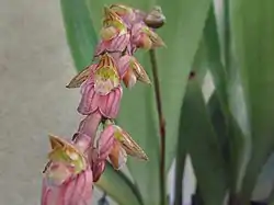 Caracterizado por un pie de la columna típicamente corto y la unión del labio que está, a menudo, profundamente incrustada en la superficie formada por la base de los sépalos laterales, la inflorescencia ramosa es densa con flores en un patrón regular o laxa con flores que tiene los sépalos laterales adpresos al raquis y que tiene la coloración púrpura. Los sépalos laterales forman un plato a la estructura en forma de cuenco alrededor del labio.