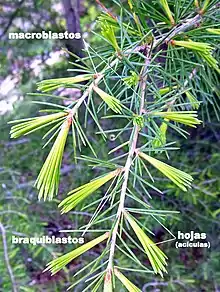 Los pinos y cedros, por otro lado, llevan sus hojas, en número variable, insertas en braquiblastos, que se articulan en las ramas, los macroblastos.