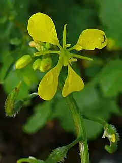 Las flores son terminales, de pequeño tamaño, vistosas. Muestran cuatro sépalos y cuatro pétalos bífidos de color amarillo pálido; tienen seis estambres, dos de los cuales son marcadamente más cortos, y anteras rizadas. El fruto es una silicua de hasta 2 cm de largo, con picos de forma cónica; contiene semillas numerosas, de alrededor de 1 mm de diámetro, color pardorrojizo y superficie reticulada.