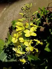 La inflorescencia es un terminal indeterminado que mide 50-100 cm (20-40 plg) de altura,[3] con flores de color amarillo o blanco. Cada flor tiene cuatro pétaloss dispuestos en forma perpendicular, así como cuatro sépalos, seis estambres y un ovario superior que es bicelular y contiene un solo estigma y estilo. Dos de los seis estambres tienen filamentos más cortos. El fruto es un silique que se abre en la madurez mediante dehiscencia para revelar semillas marrones o negras que son pequeñas y de forma redonda. La Autopolinización es imposible, y las plantas son polinización cruzada por insectos.[5] Las hojas iniciales forman una roseta que comprende de 7 a 15 hojas, cada una de las cuales mide 25-35 cm (10-14 plg) por 20-30 cm (8-12 plg);[3] después de esto, se desarrollan hojas con pecíolos más cortos y se forman cabezas a través de las hojas que se ahuecan hacia adentro.[2]