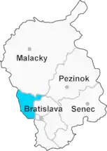 Limita al oeste y al sur con los ríos March y Danubio y con Austria, al este con Bratislava I y Bratislava III así como al norte con el distrito de Malacky.