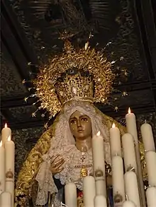Procesión de la imagen de la patrona acompañada de banda de música y festejada con fuegos artificiales. Tiene lugar el primer sábado de octubre. El día anterior a la procesión, las mujeres de pueblo salen a realizar el rezo del Santo Rosario ataviadas con mantillas.