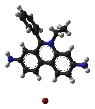 El bromuro de etidio (BrEt) es un agente intercalante usado comúnmente como aclarador de ácidos nucleicos en laboratorios de biología molecular para procesos como la electroforesis en gel de agarosa. Cuando se expone esta sustancia a luz ultravioleta, emite una luz roja-anaranjada, que se intensifica unas 20 veces después de haberse unido a una cadena de ADN. Este efecto es debido al aumento de la hidrofobia del medio, y no a la rigidificación del anillo bencénico, no estando este entre pares de bases del ADN. Como el bromuro de etidio se intercala en el ADN, hay una idea que tenga un poderoso efecto mutágeno y, posiblemente puede ser cancerígeno o teratógeno, pero la evidencia apunta que no es el caso, y que el bromuro es relativamente seguro.[2] Actualmente existen otros compuestos que cumplen con la función del bromuro de etidio y que son vendidos como más seguros por, en teoría, no tener efecto mutagénico, como el Sybr Safe (Invitrogen), el Gel Red (Biotium) o el MIDORI green (Nippon Genetics). Midori a diferencia de otros colorantes seguros no es un intercalante sino que se une al esqueleto de fosfato del ADN, lo que da como resultado bandas más nítidas en el gel de agarosa pues la estructura y estabilidad del ADN se mantienen.