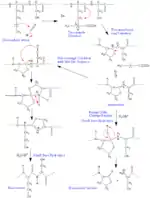 La densidad de electrones en el bromuro de cianógeno se aleja del átomo de carbono, lo que la hace inusualmente electrofílica y hacia el bromo y el nitrógeno más electronegativos. Esto deja el carbono particularmente vulnerable al ataque por un nucleófilo, y la reacción de escisión comienza con una reacción de sustitución de acilo nucleofílico en la que el bromo es reemplazado por el azufre en la metionina. Este ataque es seguido por la formación de un anillo de cinco miembros en lugar de un anillo de seis miembros, que implicaría la formación de un doble enlace en el anillo entre nitrógeno y carbono. Este doble enlace daría como resultado una conformación rígida del anillo, desestabilizando así la molécula. Por lo tanto, el anillo de cinco miembros se forma para que el doble enlace esté fuera del anillo, como se muestra en la figura.
