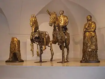 - La pieza del caballero mejor conservado corresponde a un hombre de edad madura —unos 40 años—, cuyas prendas le identifican como un militar de alto rango en tiempos de paz, y, además, la posición de su brazo derecho, levantado en símbolo de paz afianza esta suposición. Poco se conserva de la figura del otro caballero.