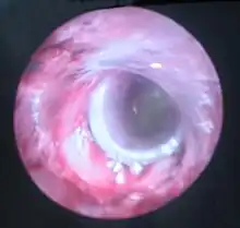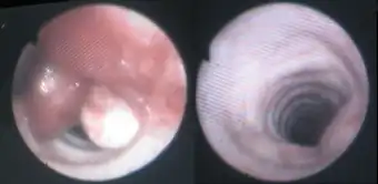 Las complicaciones, son las mismas identificadas para la broncoscopia rígida: Luxación y laceración de las cuerdas vocales y el aritenoides, perforación de subglotis, tráquea, bronquios, hemoptisis masiva y neumotórax. También existe la resección con un catéter rígido que permite realizar succión y microdebridamiento, con menos trauma sobre la vía aérea.[9]