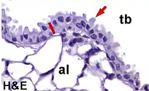 El epitelio de los bronquiolos distales (respiratorios), ya no presenta células ciliadas y se mantiene húmedo mediante el lubricante segregado por las células de Clara.[10]