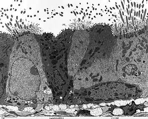 Su interior está tapizado por un epitelio, formado por al menos cuatro tipos de células, que varían en su ubicación y número.