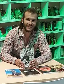 Bruno Adrián Biondani es autor de dos novelas policiales; "El Suicida",[2] y "El Séptimo Rayo".[3] Ambas fueron presentadas en la Feria Internacional del Libro de Buenos Aires.[4][5] También es conocido como Barbú Gorila,[6][7][8][9][10] dado que utilizó un disfraz de gorila para presentarse así como escritor y promocionar sus primeros cuatro libros. En 2009 publicó su primer libro de cuentos, La Fuga del Tiempo,[11] bajo el seudónimo de Barbú, con el cual siguieron tres títulos más: El Narrador (2010), Huellas en Discordia (2012) y El Orador (2014). La portada de los libros "Huellas en Discordia" y "El Orador" corresponden a pinturas del muralista y artista plástico Cristian English.[12][13] Todas las obras literarias firmadas como Barbú también fueron presentadas en la Feria Internacional del Libro de Buenos Aires,[14] presentándose justamente disfrazado de Gorila. Su particular forma de aparecer públicamente causó curiosidad en el mundo mediático de la televisión Argentina y Anabela Ascar[15] lo entrevistó en varias oportunidades[16][17] en su programa Hechos y Protagonistas de Crónica Televisión.