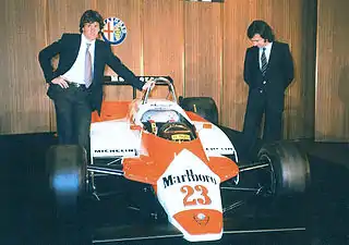 ![]() Giacomelli (derecha) junto al Alfa Romeo de 1982. | ||