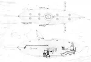 El submarino media 10 pies 6 pulgadas (3,20 m) de largo por 27 pulgadas (0,69 m) de alto y 25 pulgadas (0,64 m) de ancho, y desplazaba cerca de seis toneladas cuando estaba sumergido.[1] Lo equiparon con ocho claraboyas en la tapa para proveer de luz al interior, y de una portilla superior, una torre retractable para la navegación superficial. Para la propulsión, tenía tres sistemas de paletas de pie de pato y un timón grande. También lo equiparon con compuertas cubiertas con piel de foca para hacer algunas manipulaciones fuera del casco, con un sistema pequeño de lastre con una palanca y un pistón, y de un ancla de 50 libras (22,7 kg).
