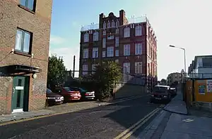 Calle Durward, desde el oeste, en 2006. Nichols fue encontrada junto a la pared baja de ladrillos. Al fondo la Escuela Board, existente en 1888.
