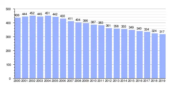 | Gráfica de evolución demográfica de Budiño entre 2000 y 2019 |