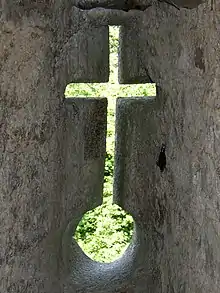- Tronera de doble cruz, compuesta por un orificio circular y una abertura vertical con dos (puede haber más) aberturas transversales para observación.