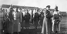 El mismo mes de junio, el Ejército se había mostrado incapaz de contraatacar en Yerbichna, fracaso que puso de manifiesto sus malas condiciones y desmoralización.[141][153] Las raciones de los soldados, a pesar de las órdenes contrarias del mando, se habían reducido aún más en calidad y cantidad, en consonancia con la escasez de alimentos que sufría todo el país.[127] Malinov, que heredó la composición de las Cortes de Radoslavov, tuvo que afrontar la creciente exigencia del Ejército de que se firmase la paz, a lo que Alemania respondió enviando en su socorro parte de las tropas que estaba retirando de Macedonia al mando de los reyes de Baviera y Sajonia que, sin embargo, no lograron estabilizar el frente.[150] Malinov procedió entonces a liberar a algunos presos políticos, entre ellos a Stamboliski (25 de septiembre[156][157][158]).[150][159] Otro agrario, Daskalov, de visita en el frente que los Aliados acababan de atravesar en Dobro Polye[160][161] el 18 de septiembre tras el comienzo de su dura ofensiva el 14,[162][163][161] logró el respaldo de las tropas para proclamar una república[160][164] de la que nombró a Stamboliski[159] presidente el 27 de septiembre.[150][165] Las unidades aún fieles fueron incapaces de cubrir el hueco dejado por las amotinadas y detener el avance de los Aliados.[163] Los Aliados habían conseguido romper el frente tras duros combates en Dobro Polye, donde superaban en dos a uno a los búlgaros y quintuplicaban su artillería, pero fueron rechazados cincuenta kilómetros al este, cerca del lago Doiran, donde unidades griegas y británicas avanzaron contra las líneas búlgaras.[162][163] El 19 dos divisiones búlgaras se habían rendido finalmente en Dobro Polye[166] y se preparaban para marchar[161][167] en rebeldía sobre la capital.[168][164] En la zona occidental del frente, los búlgaros también habían logrado mantener sus posiciones.[163] La necesaria retirada para no quedar aisladas por el avance de la Entente produjo revueltas entre las tropas.[169] Tras arrasar el cuartel general de Kyustendil[167] (24 de septiembre)[161] marcharon sobre la capital.[150][89] Su ataque, que se produjo a la vez que la firma del armisticio con los Aliados en Salónica[170] (10:30 p. m. del 29 de septiembre[171][172]),[156][152][173][160] fue rechazado merced a la intervención de tropas leales al Gobierno y unidades alemanas,[174][157][160][175][167][154] sufriendo ambos bandos unas mil quinientas bajas.[150][156] El 25[89] el Consejo de Ministros había decidido negociar con la Entente[158] ante la imposibilidad de mantener por sí mismo el frente y la falta de ayuda inmediata de sus aliados.[156] Tres delegados viajaron junto con el cónsul estadounidense[167] y su ayudante a tratar con los Aliados la misma noche del 25.[158] Días antes Malinov había tratado desesperada e inútilmente de lograr la mediación estadounidense para detener la ofensiva aliada; utilizando este intento de acercamiento a los Estados Unidos, logró que alemanes, austrohúngaros y otomanos le cediesen por fin toda la Dobruja el 22 con el fin de tratar de evitar la rendición búlgara.[168] La cesión formal tuvo lugar el 25, mientras el gabinete búlgaro discutía la firma del armisticio con la Entente, que aprobó una vez obtenida la concesión territorial de sus coligados.[168]