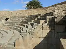Edificio de tamaño medio con una influencia de 60 metros sobre 50 metros,[55] sus tres primeros rangos de gradas estaban reservadas para las personalidades locales y son más anchas que las destinadas a otros espectadores; una balaustrada que separada los dos espacios de la cavea.[57] Las galerías de circulación, la cavea y la escena se encuentran en un estado de conservación satisfactorio mientras que no quedan más que unos pocos vestigios del muro de la escena. Un pavimento de opus sectile y además de un mosaico tardío que representa un oso ocupa la orquesta del edificio.[54]